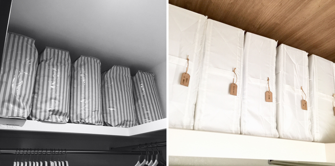 叠好的被子用防尘储物袋装好,根据需要放入干燥剂,塞到衣柜最上面就好啦。